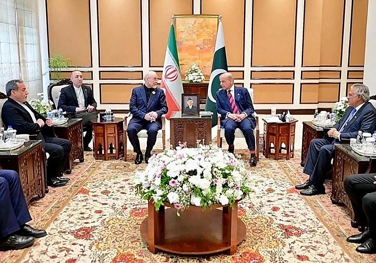 El primer ministro pakistaní, Shehbaz Sharif, se reúne con el presidente del Parlamento iraní, Mohammad Bagher Ghalibaf, en Islamabad.