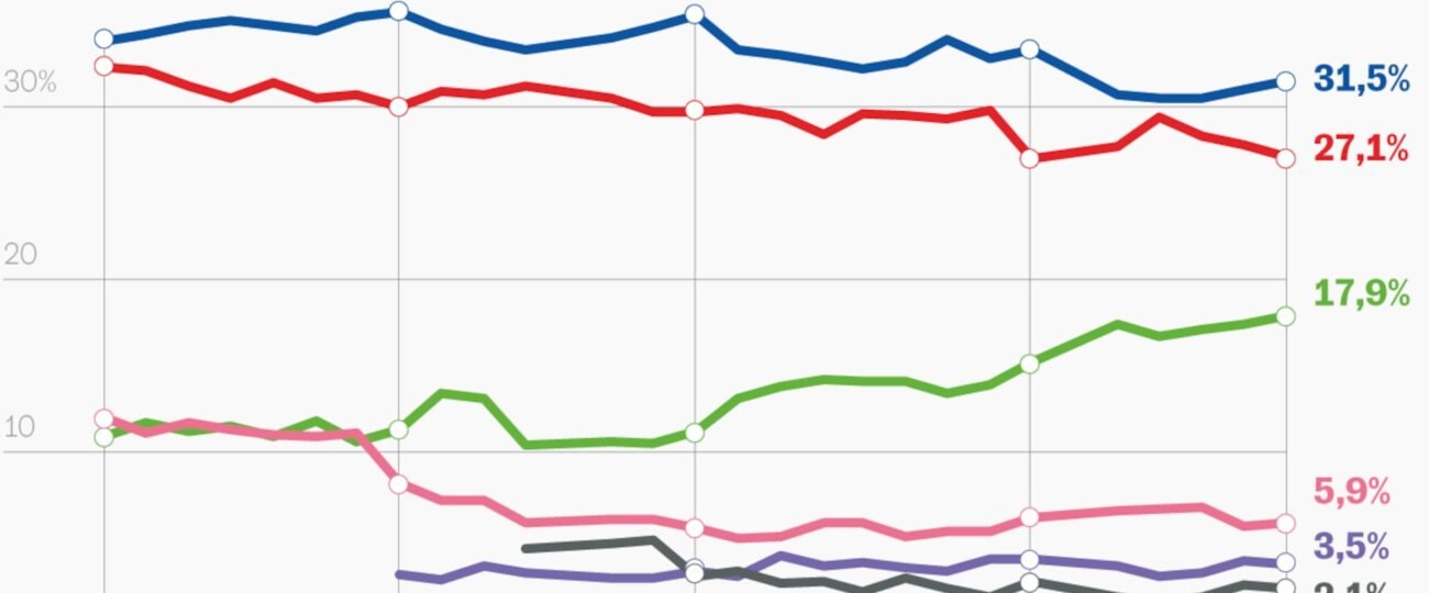 Los socialistas, con un 27,1%, pierden siete décimas respecto al sondeo anterior, lo que los sitúa casi cinco puntos porcentuales por debajo de su resultado en las urnas en 2023.